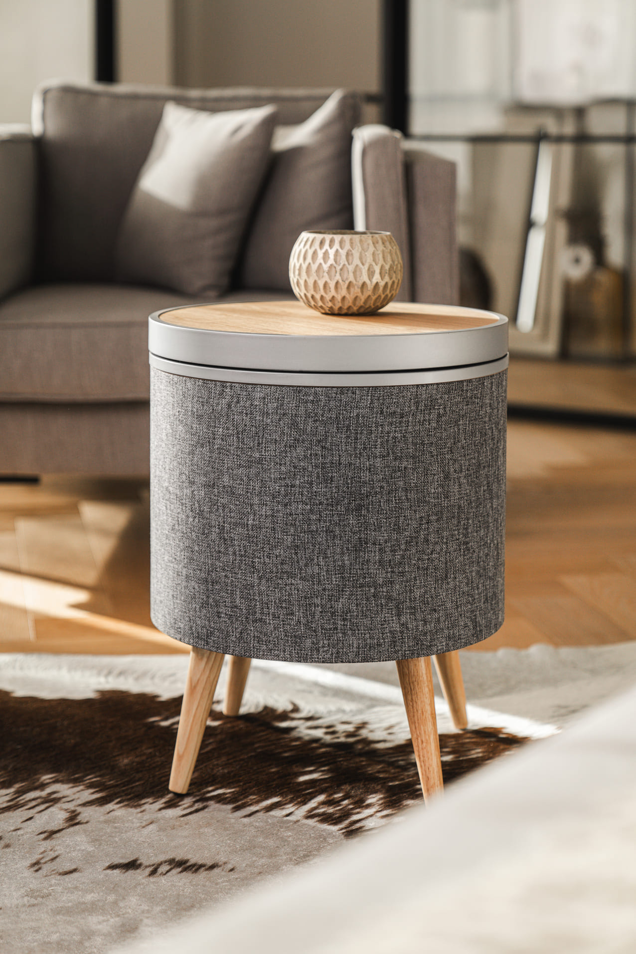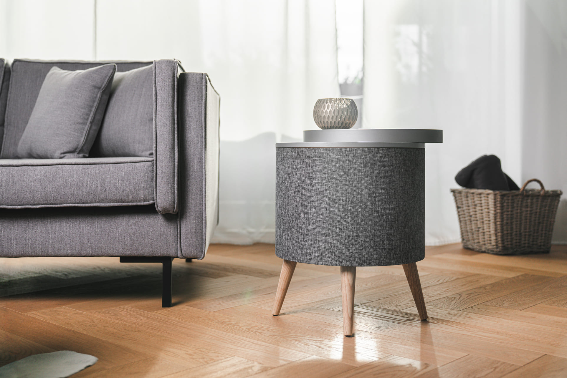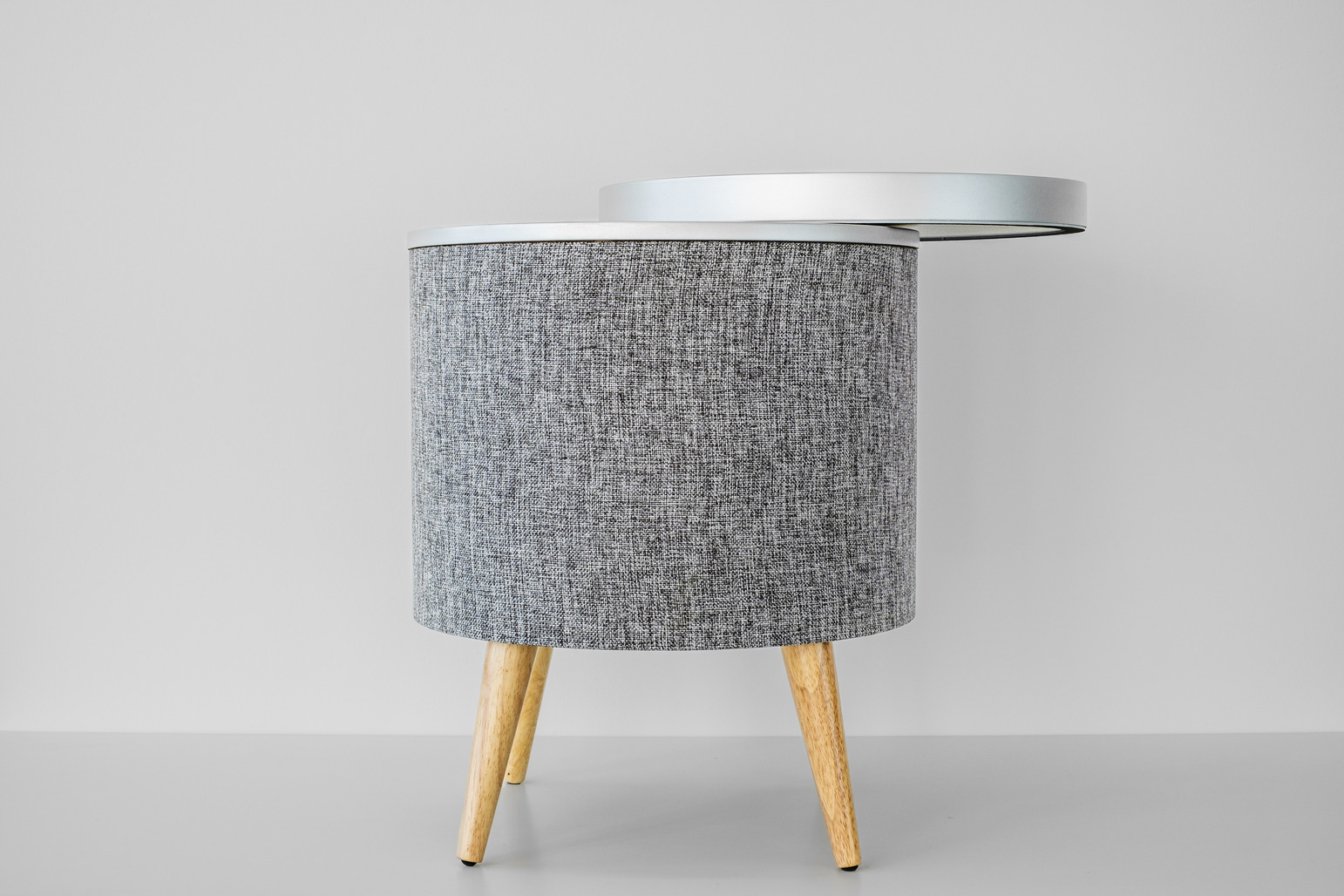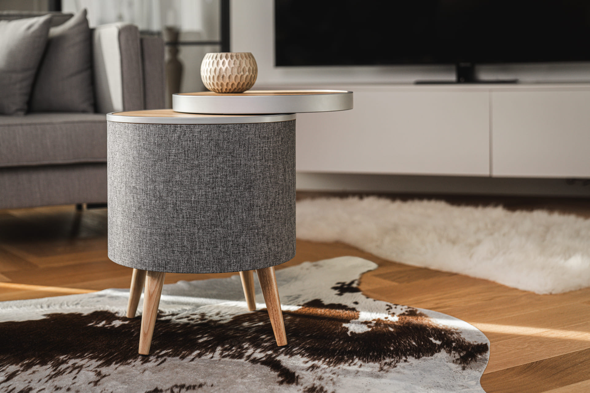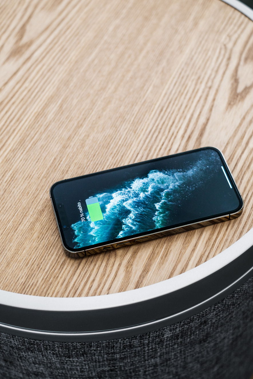 Bezdrátový reproduktorový stolek s výkonem RMS 65 W, přenosem Bluetooth 5.0 a dotykovým ovládáním na horním panelu. 3pásmový audio systém se subwooferem o průměru 16.5 cm, dvěma širokopásmovými měniči a dvěma tweetery. Bezdrátové i drátové dobíjení telefonů (10 W), vstup AUX Jack 3.5 mm, přednastavené křivky EQ, možnost TWS propojení dvou reproduktorů (stereo),  napájení ze sítě.